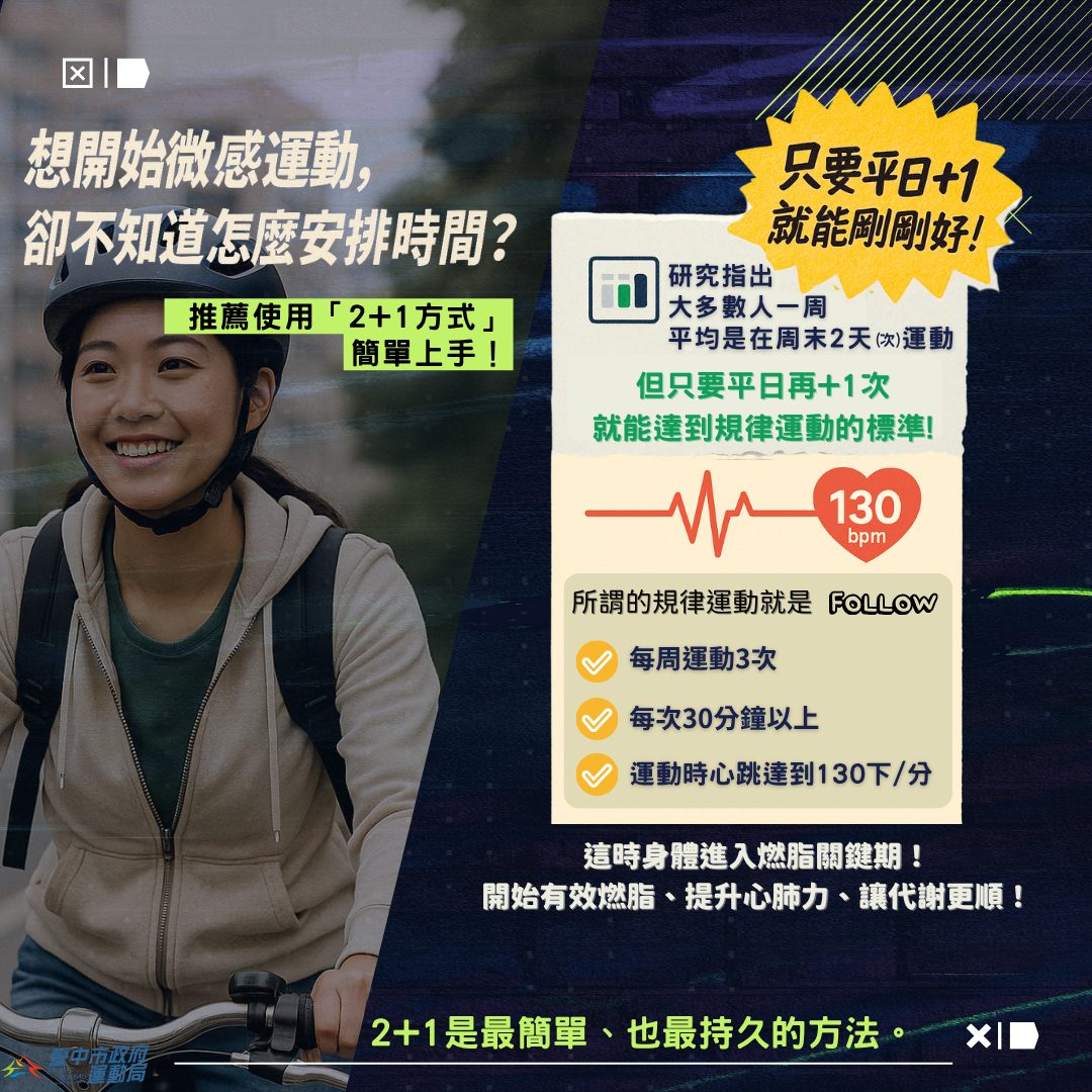 🌿 微感運動 Micro Workout|忙碌生活中的新選擇! 臺中市潭子區公所‧民政課 2025-12-10 不必爆汗、不追求高強度, 只要微喘、微累、微汗,你就已經開始在動了! ✔️步行代替開車 ✔️騎腳踏車通勤 ✔️利用空檔簡單伸展 #微感運動#MicroWorkout #運動不一定難#身體正在感謝你