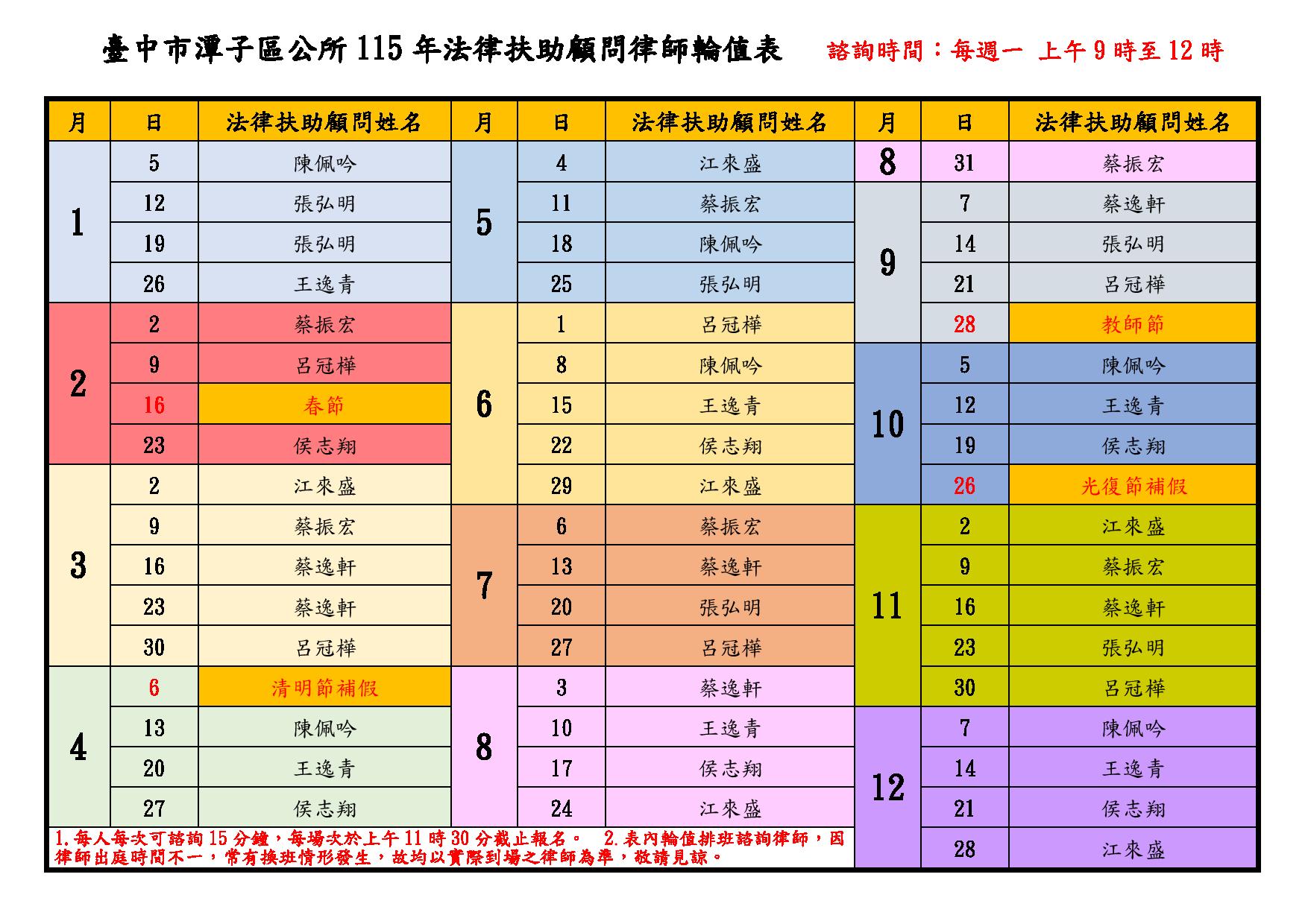 臺中市潭子區公所115年法律扶助顧問律師輪值表