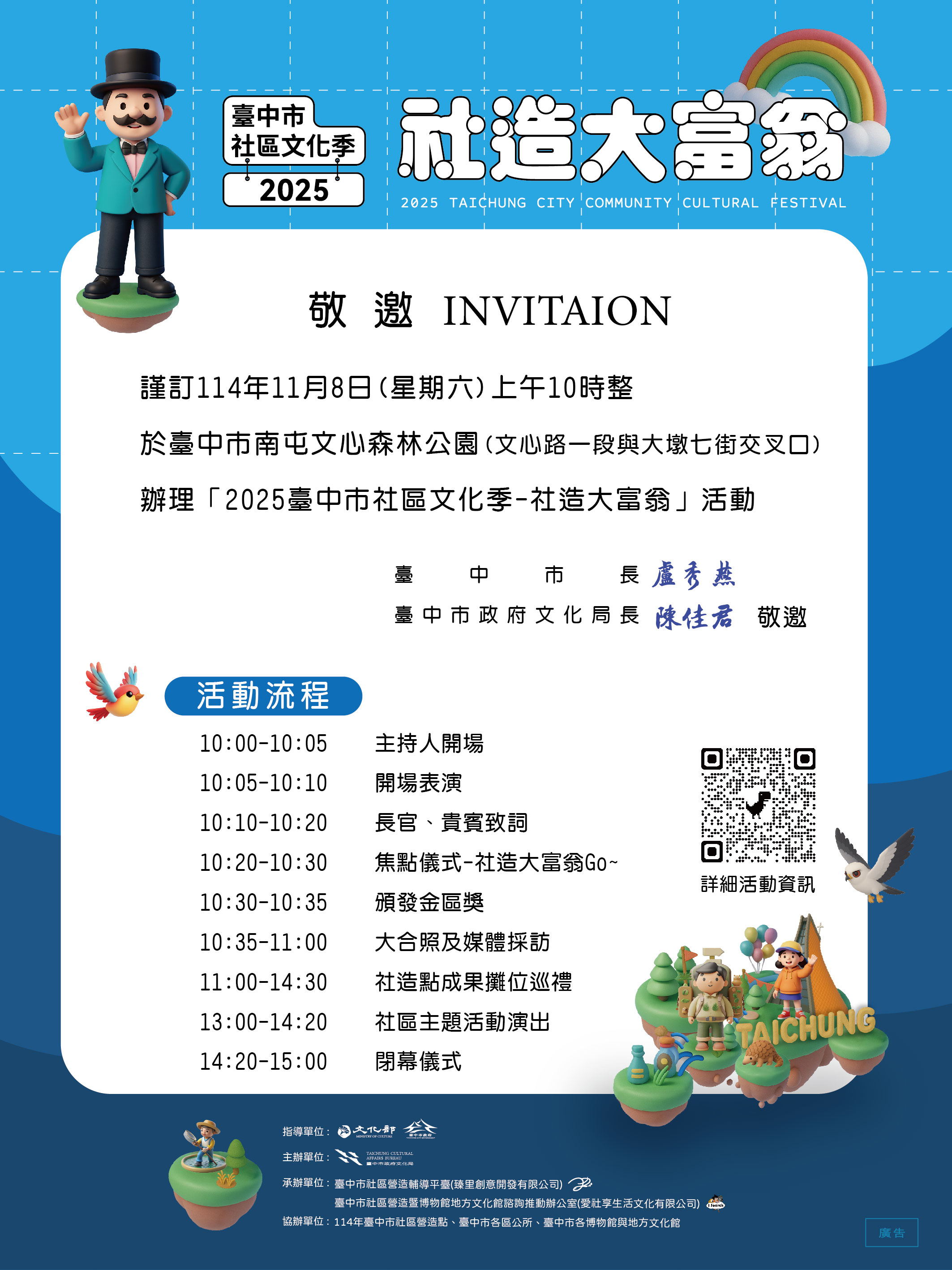 一、 為展現臺中市社區營造成果,串聯114年度社造點、各區公所、社區大學等,共同呈現社區的主題特色,於本市文心森林公園南側溜冰場(文心路一段與大墩七街交叉口)上午10時至15時舉行,歡迎踴躍參加。