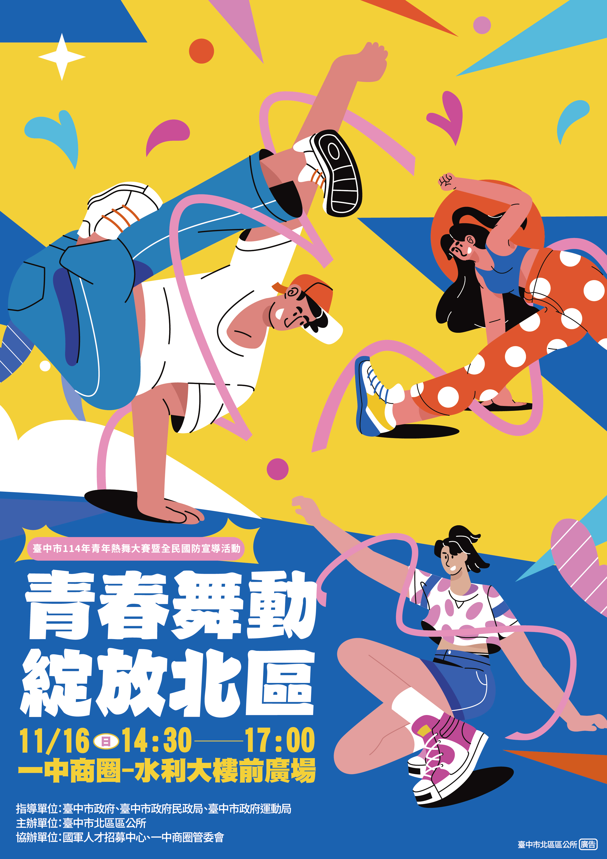 一、 為鼓勵青少年投入正當休閒運動活動,透過熱舞調劑身心與培養運動精神,並藉機向大眾宣導全民國防之重要,因而舉辦「臺中市114年青年熱舞大賽暨全民國防宣導活動」,活動訂於114年11月16日(星期日)下午2時30分至5時於臺中市一中商圈水利大樓前廣場(臺中市北區尊賢街7號)舉辦。