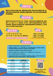 三、 本(114)年10月20日上午10時開放線上報名,相關活動訊息可至本所臉書粉絲專頁(https://www.facebook.com/tcnorth.gov)參閱。
