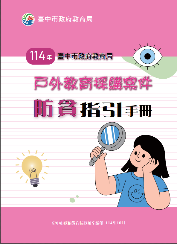 爰此,本府教育局特編印《戶外教育採購防貪指引》,收錄多起經司法認定或實務調查之典型案例,經去識別化處理後,依事件性質,分析可能的風險態樣,並研擬可行的防治措施。內容涵蓋從招標文件保密、評選過程公平、公帑核銷正確,到驗收程序落實等多個面向,期望藉由案例的警示作用,使承辦人員理解法律規範背後的制度意旨,並在日常業務中主動落實廉政觀念。