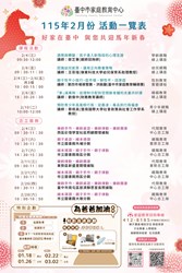 臺中市家庭教育中心115年2月份活動資訊,請參閱附件海報,歡迎報名參加。