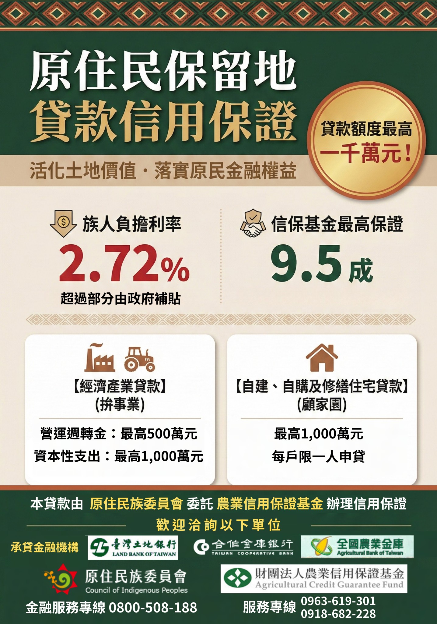 原住民保留地貸款信用保證 鑒於臺中市都會區之原住民族人對於本案政策性貸款之高度關切,為落實資訊公開、強化溝通說明,並保障原住民族金融權益,爰原住民族委員會增辦臺中市都會區場次。 一、增辦說明會時間及地點如下: (一)時間:115年4月1日(星期三)晚間7時至9時。 (二)地點:臺中市原住民族文化館二樓視聽室(臺中市大雅區仁愛路69號)。