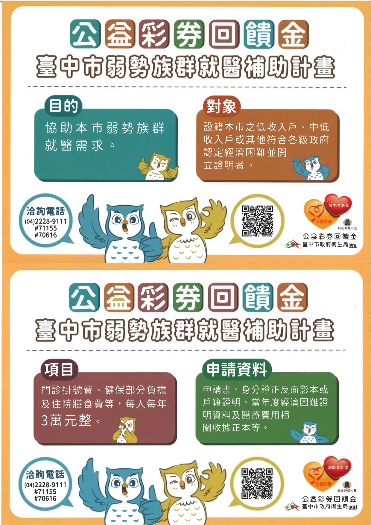 有關衛生局辦理115年度「公益彩券回饋金-臺中市弱勢族群就醫補助計畫」,詳如下列說明與附件。
