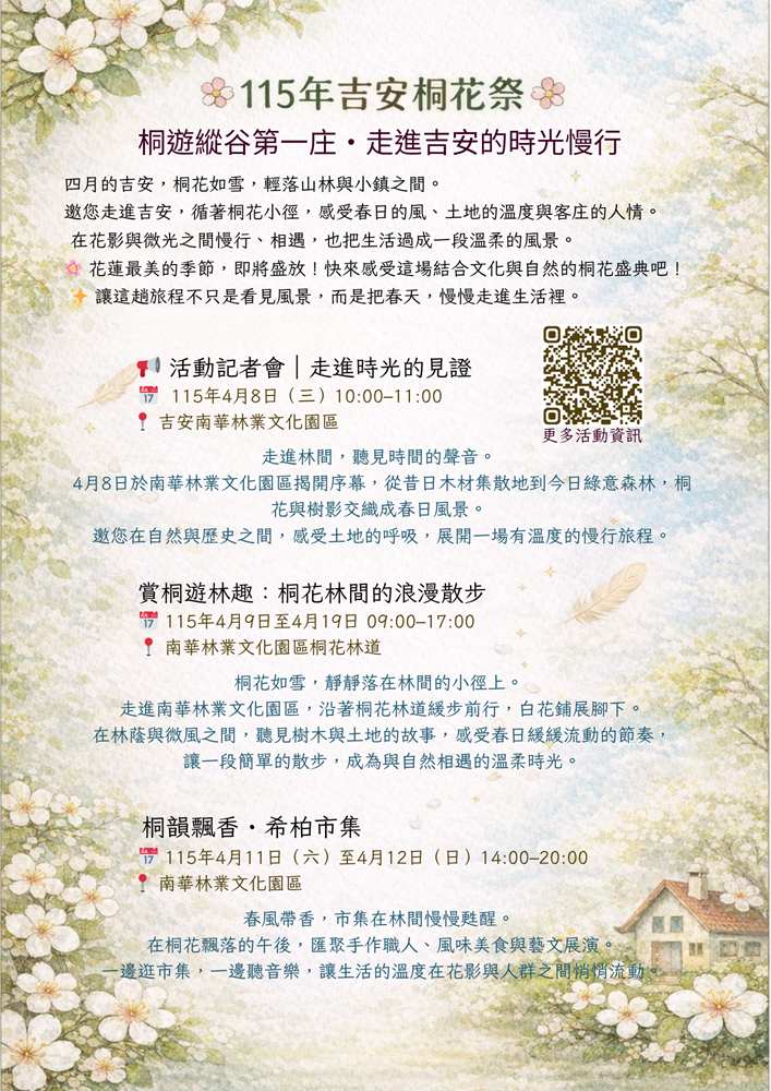 一、 為推廣花蓮縣吉安鄉客家文化藝術與自然景觀之美,特別規劃辦理「2026吉安桐花祭」系列活動。本次活動特別結合南華林業文化園區之歷史底蘊,透過慢行體驗、藝文市集與在地住宿優惠,引領民眾走進自然,感受土地與人文交織的時光慢行。