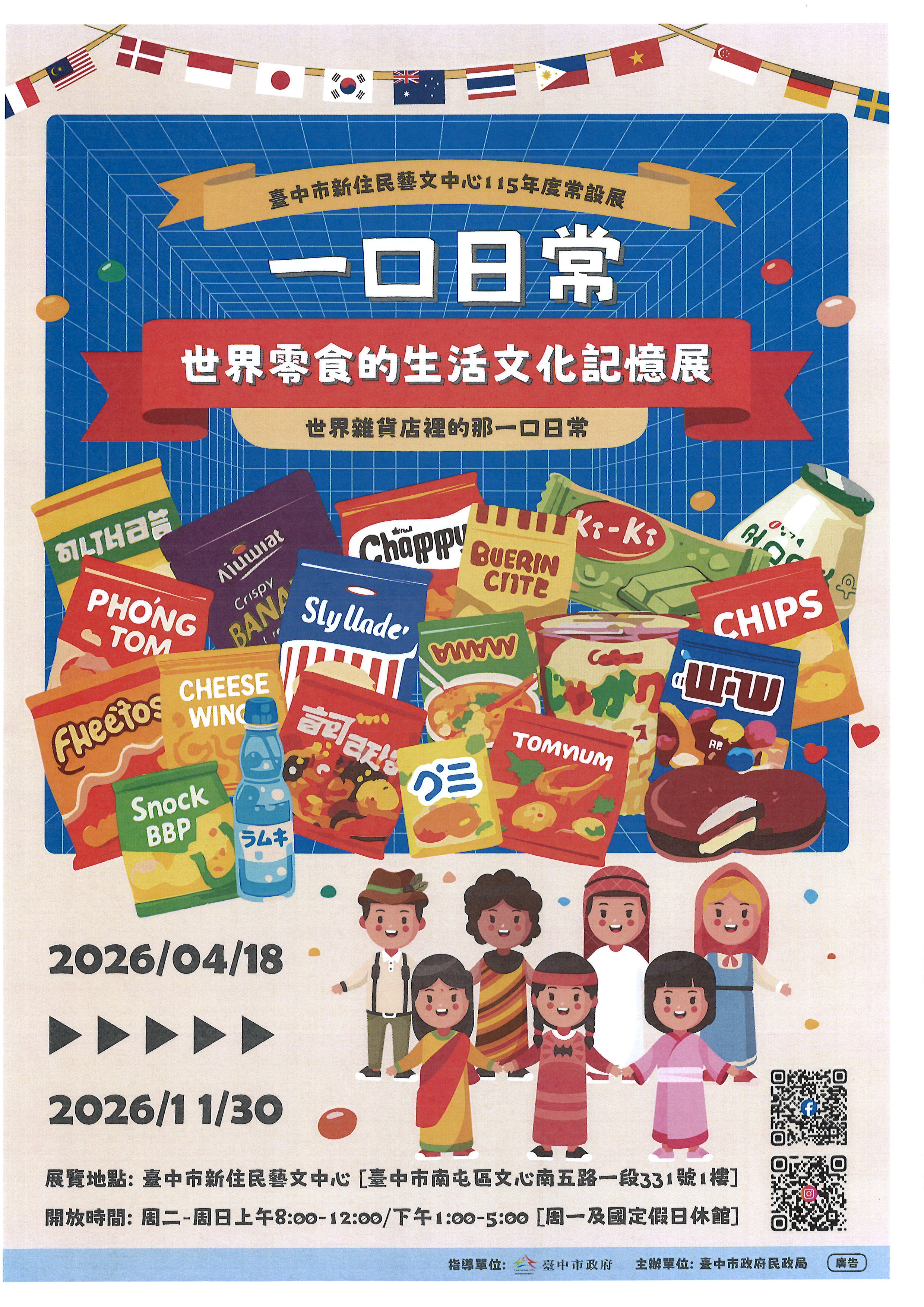 為促進多元文化交流,自本(115)年4月18日起至11月30日止,於本市新住民藝文中心(臺中市南屯區文心南五路一段331號1樓-豐樂雕塑公園內)舉辦以「各國零食」為主題的「一口日常.世界零食的生活文化記憶展」常設展,歡迎蒞臨參觀。
