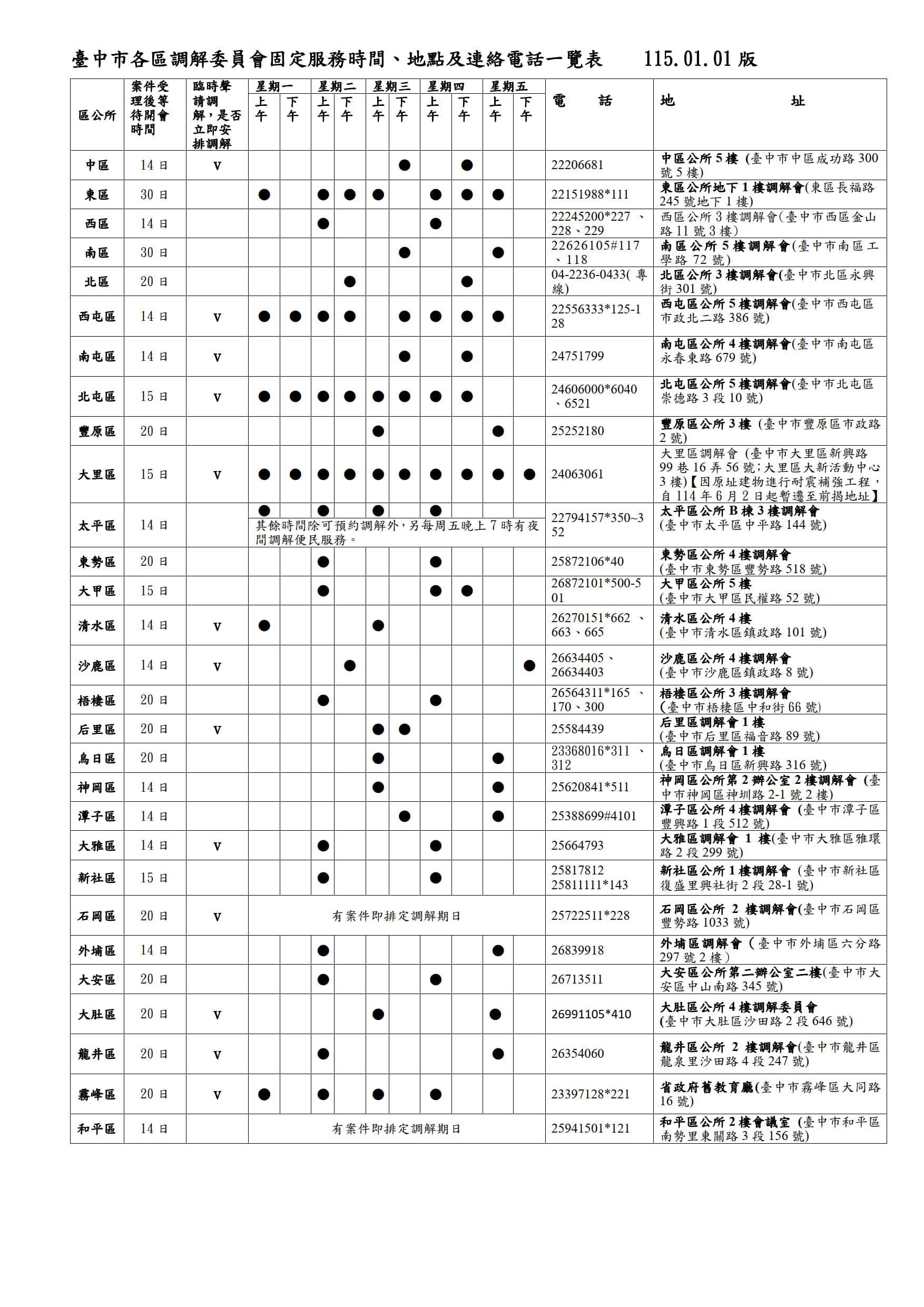 臺中市各區調解委員會固定服務時間、地點及連絡電話一覽表及調解相關表件
